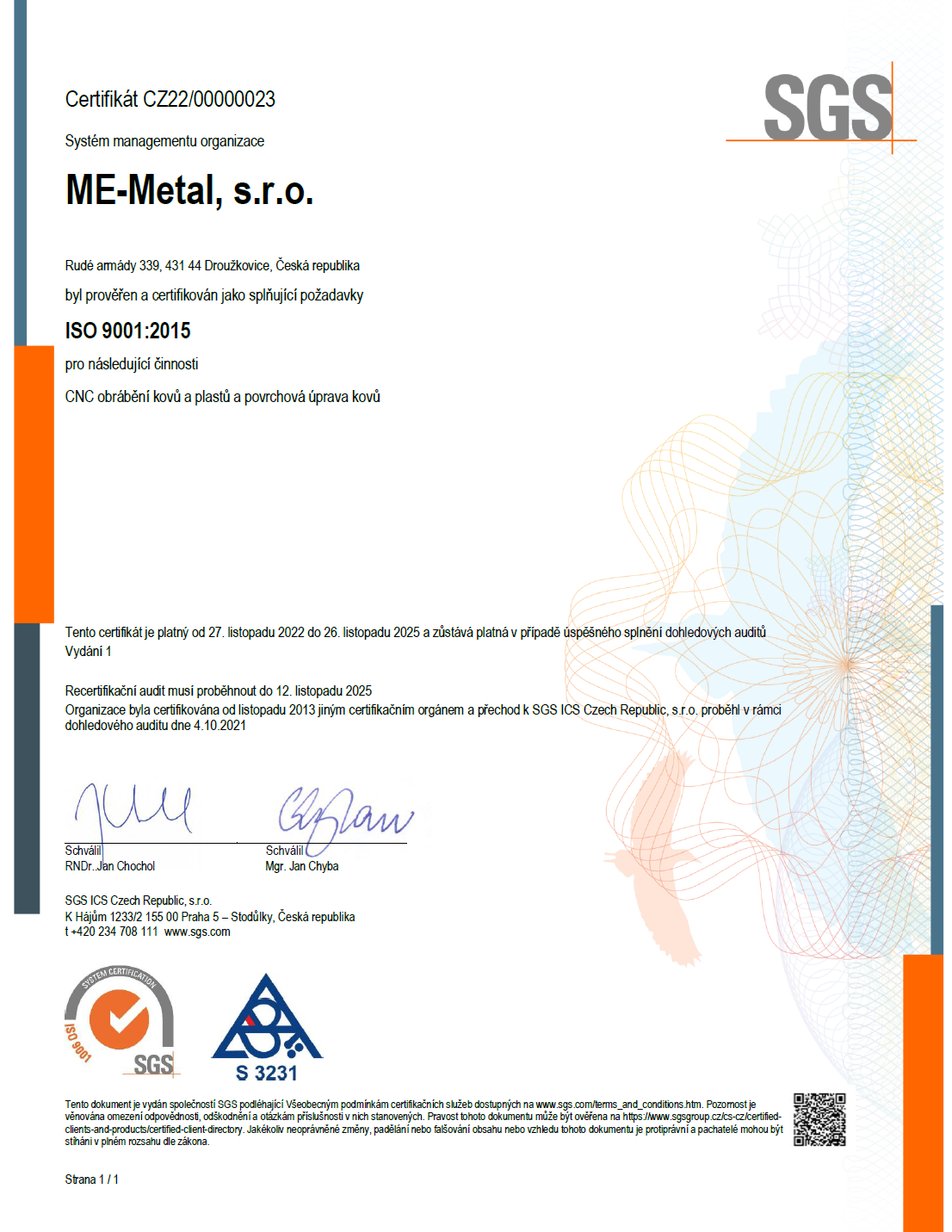 Dbáme na vysokou kvalitu a přesnost výrobků, kterou můžeme, díky kvalifikaci našich zaměstnanců, garantovat. Jsme držiteli certifikátu ISO 9001.
